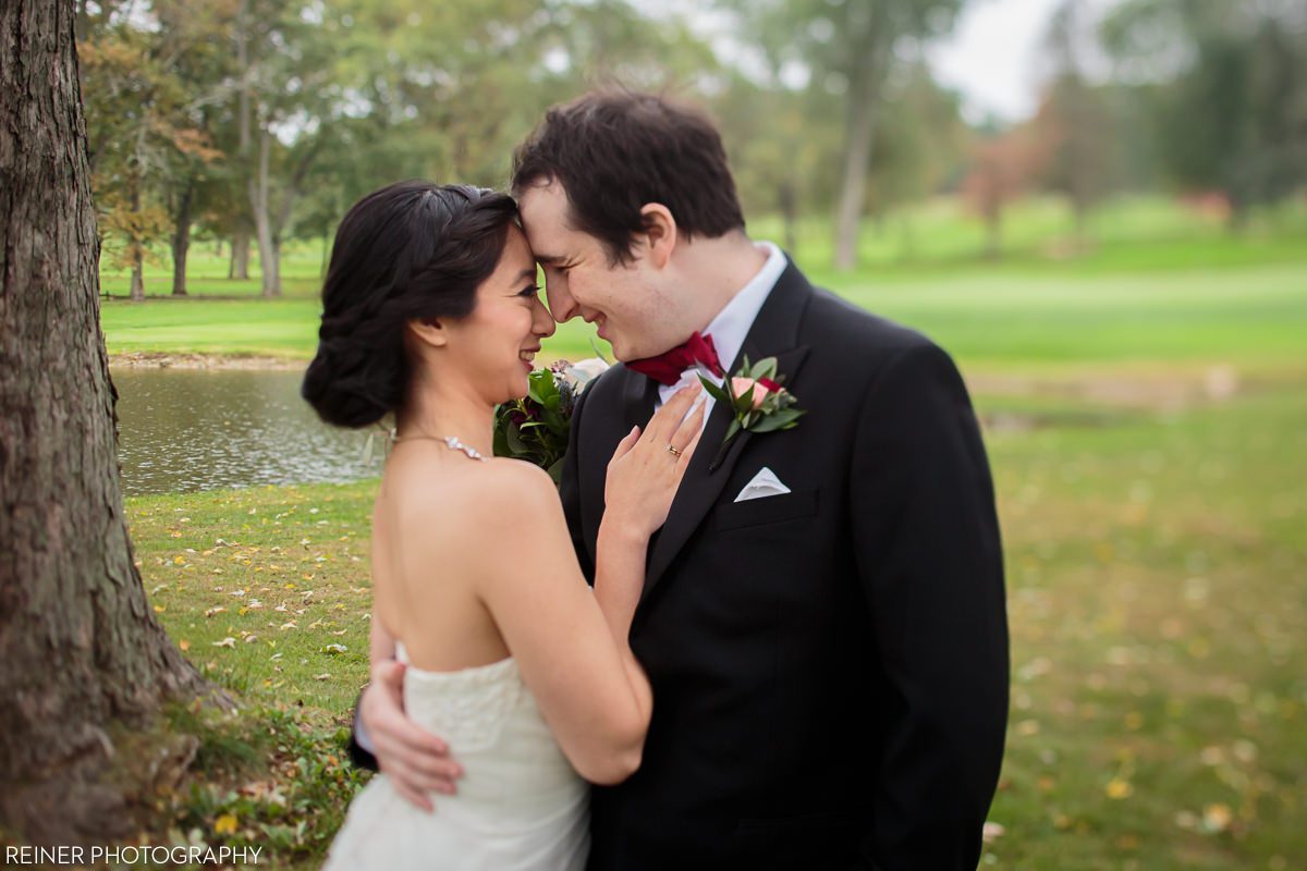 After checking in with Jane and then Jeff, and getting a few of the classic ‘getting ready’ wedding day images, I was getting super nervous about the weather so we decided not to wait too much longer and just get outside for some pictures before it started to rain. We did their ‘first look’ photos and portraits just a few steps out front of the Country Club, instead of venturing off to some far-away location elsewhere on the golf course. This worked out really well because all of the nice gardens and flowers are situated right around this area, and it gave me some interesting backgrounds and foreground elements to use for their bride and groom portraits. Jane and Jeff were doing a great job looking dapper, like they had practiced!