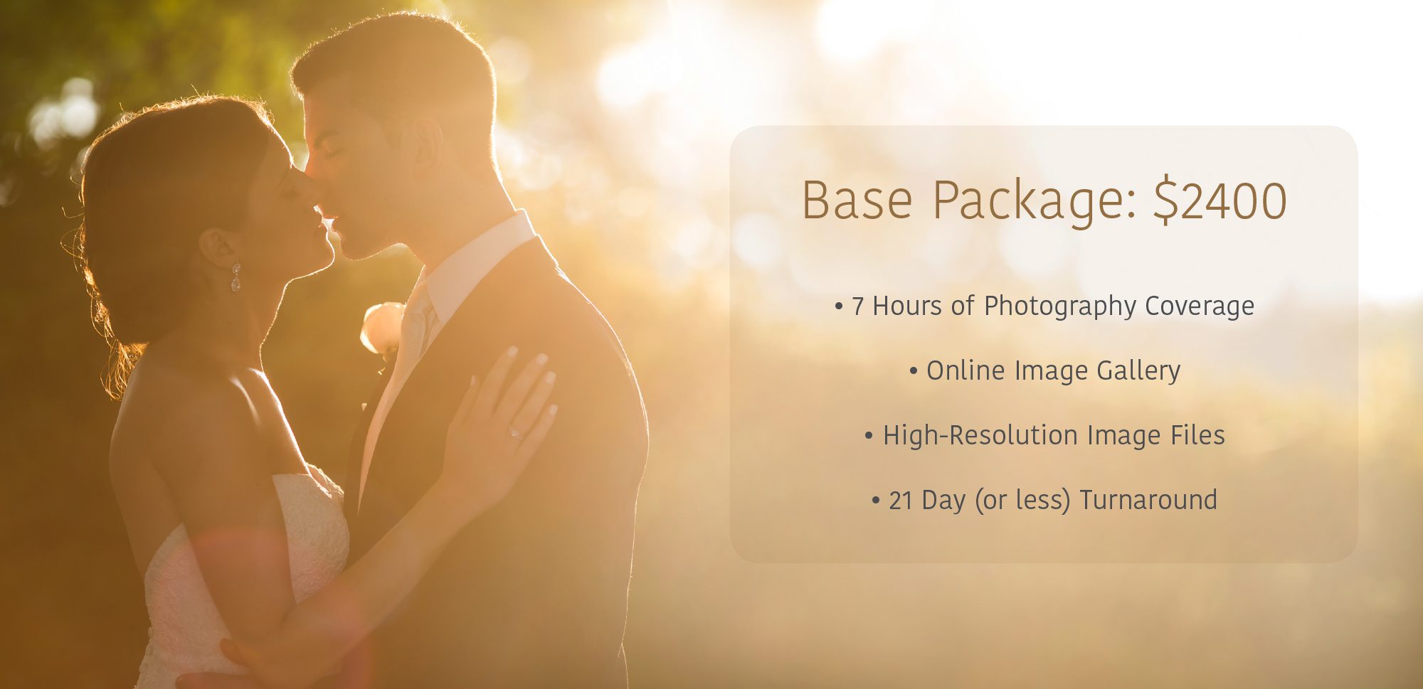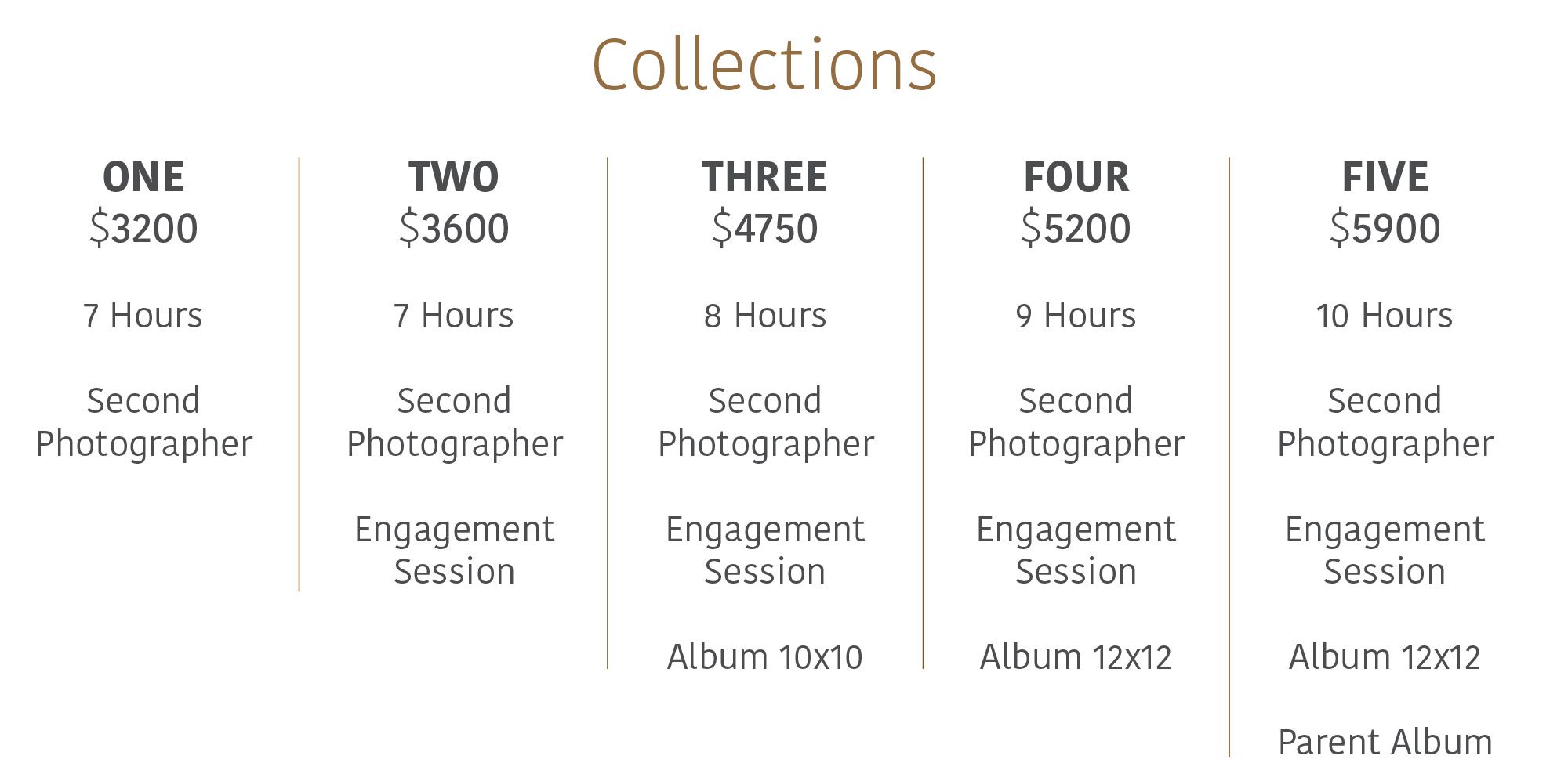 All of our Wedding Photography Collections feature at least 7 hours of coverage, an online gallery for printing and sharing images, and your high-resolution images delivered on a flash drive.