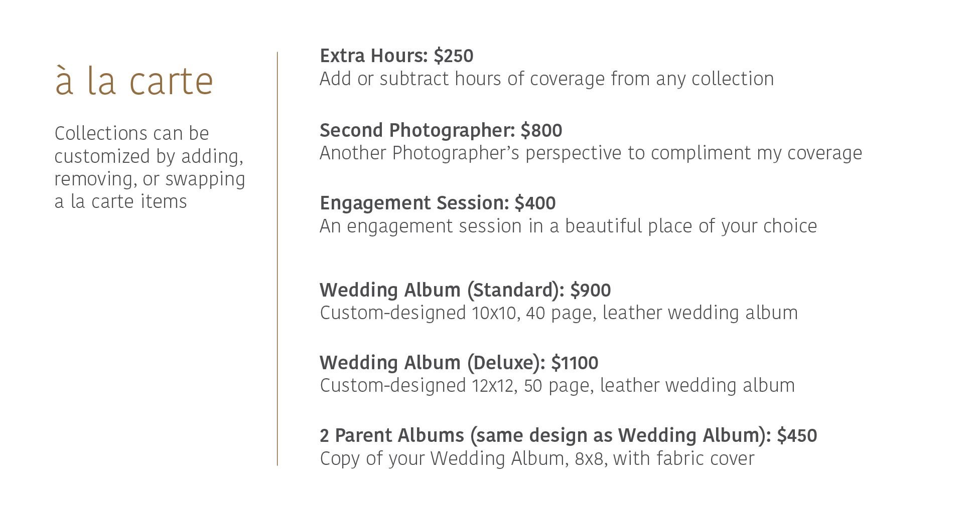 You can choose one of our most popular Photography Collections below, or build a Custom Collection with the Base Package combined with the à la carte Menu.