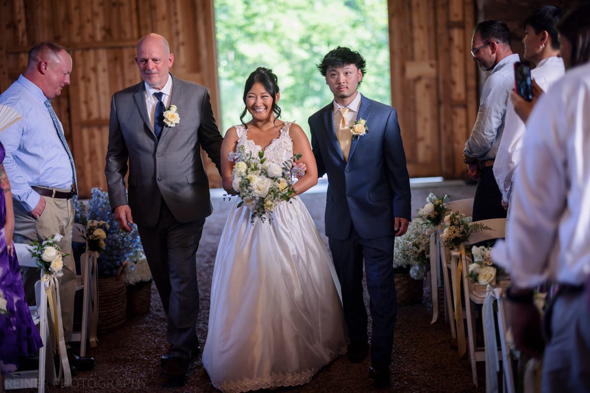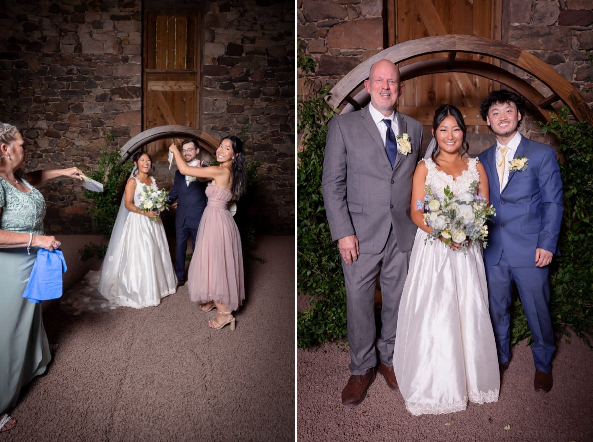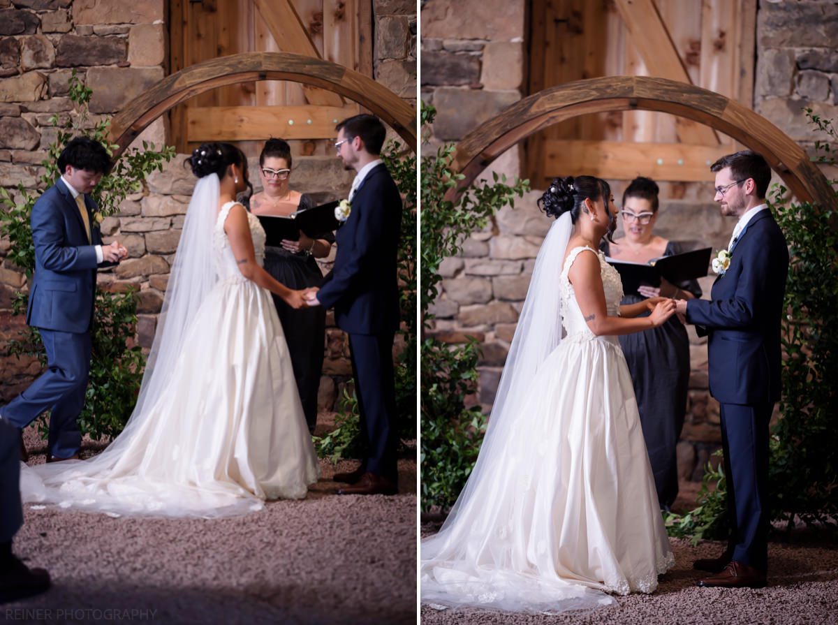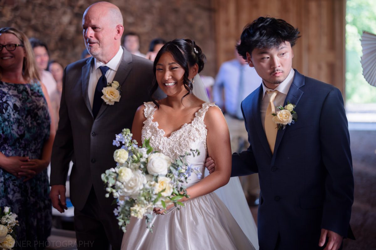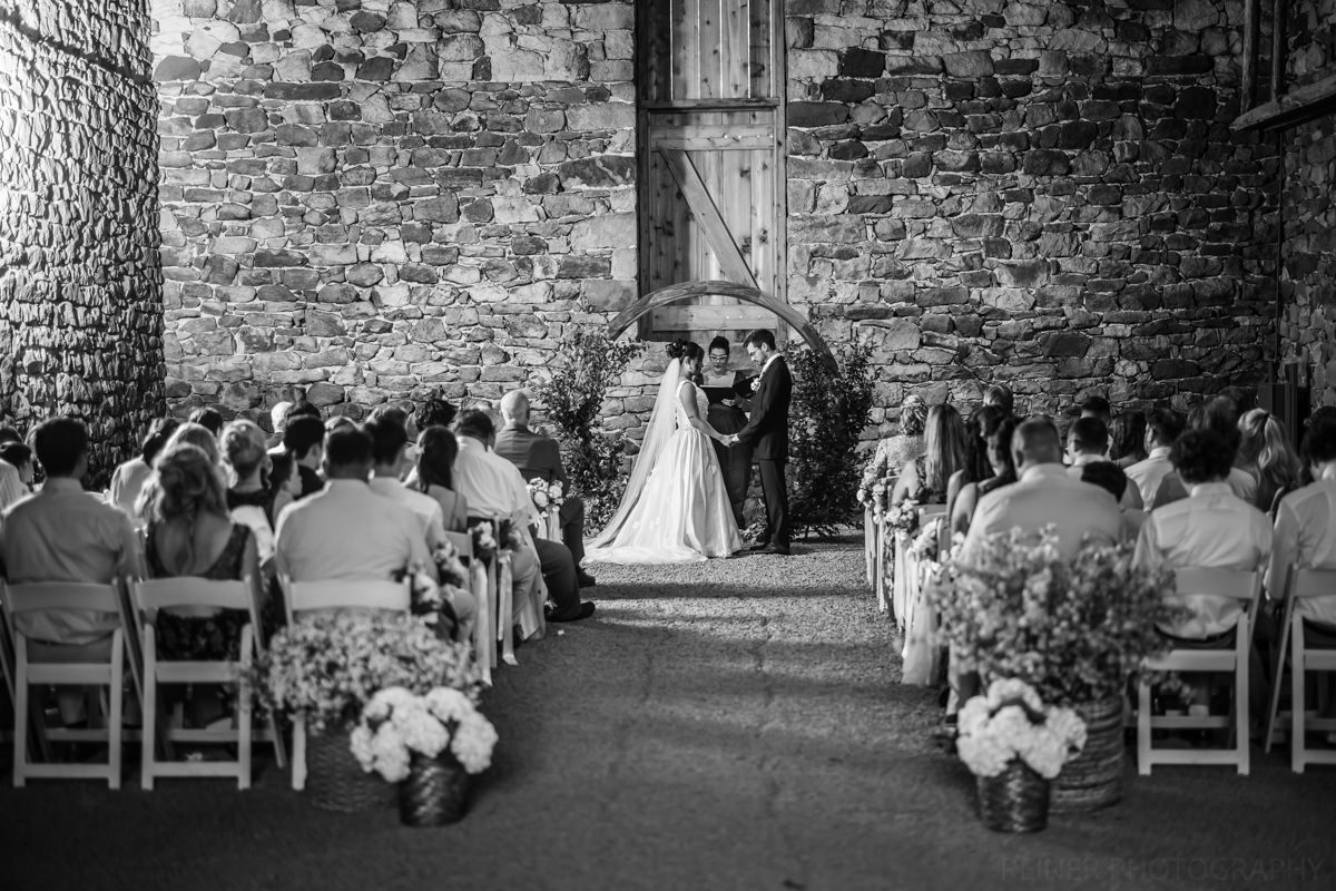 With the heat cranking, the ceremony got moved into the barn. Moody, dim, and definitely not ideal lighting conditions for photos. Curveball? Maybe. But I had my strobe from portraits ready to go, plugged it into the wall, and lit it up.