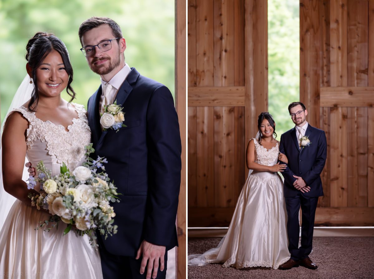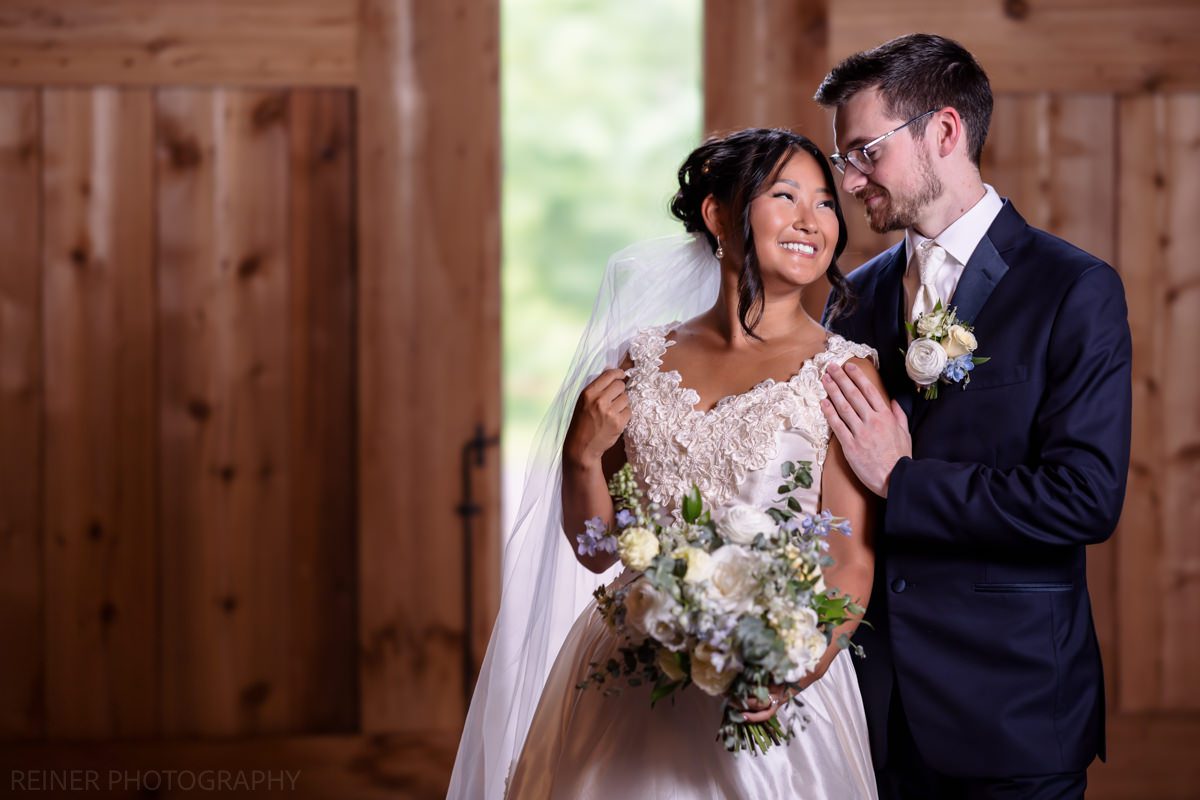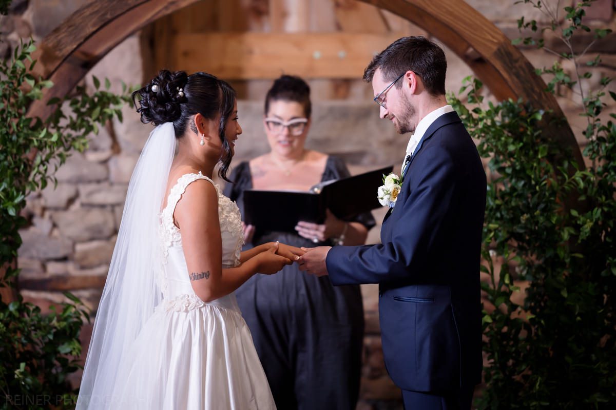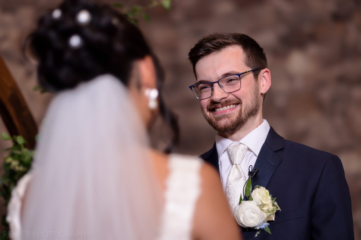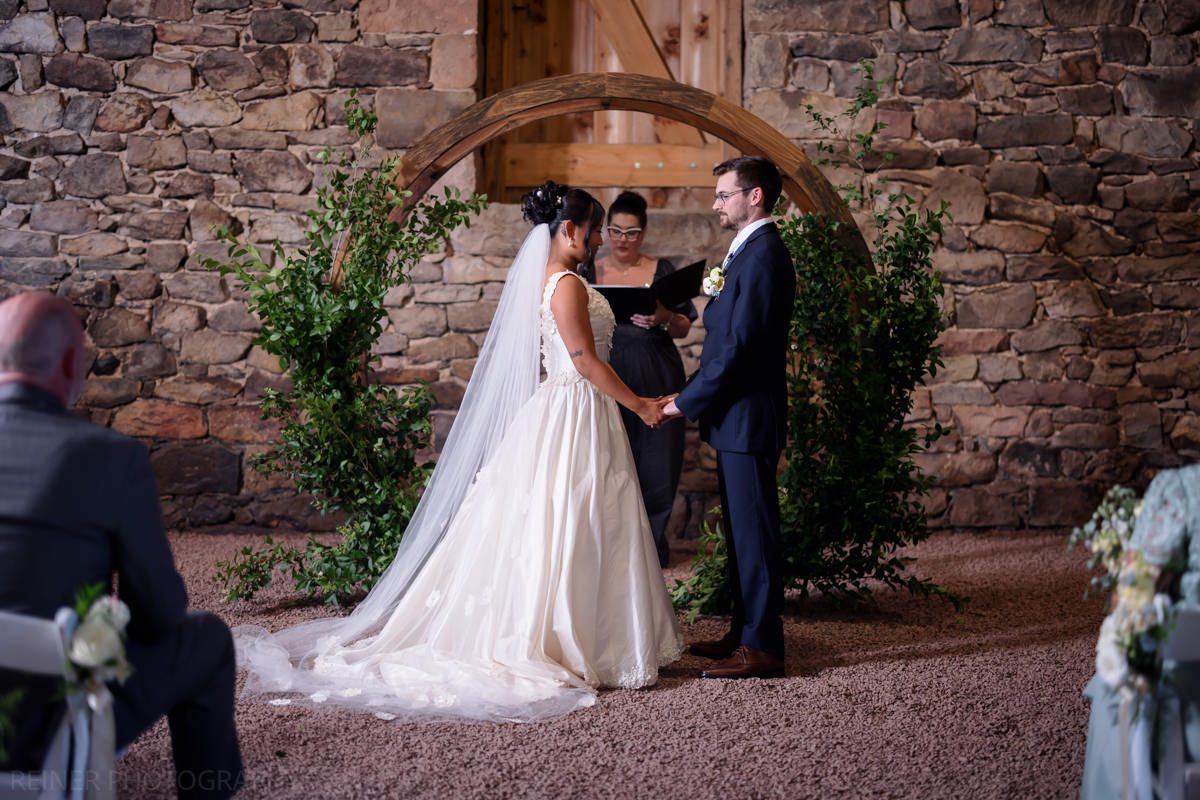 With the heat cranking, the ceremony got moved into the barn. Moody, dim, and definitely not ideal lighting conditions for photos. Curveball? Maybe. But I had my strobe from portraits ready to go, plugged it into the wall, and lit it up.